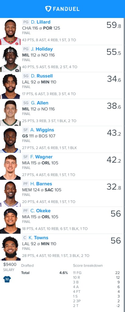 Jrue Holiday: Some say it was a revenge game. I say the reason I aggressively played Jrue was because Giannis Antetokounmpo, Khris Middleton, Bobby Portis, Thanasis Antetokounmpo Brook Lopez, and Donte Divincenzo were all out. With all those players out, Jrue has a usage rate of 42% god damn. With the depleted roster going against an awful New Orleans Pelicans defense, Jrue was the most popular on the slate for a reason.